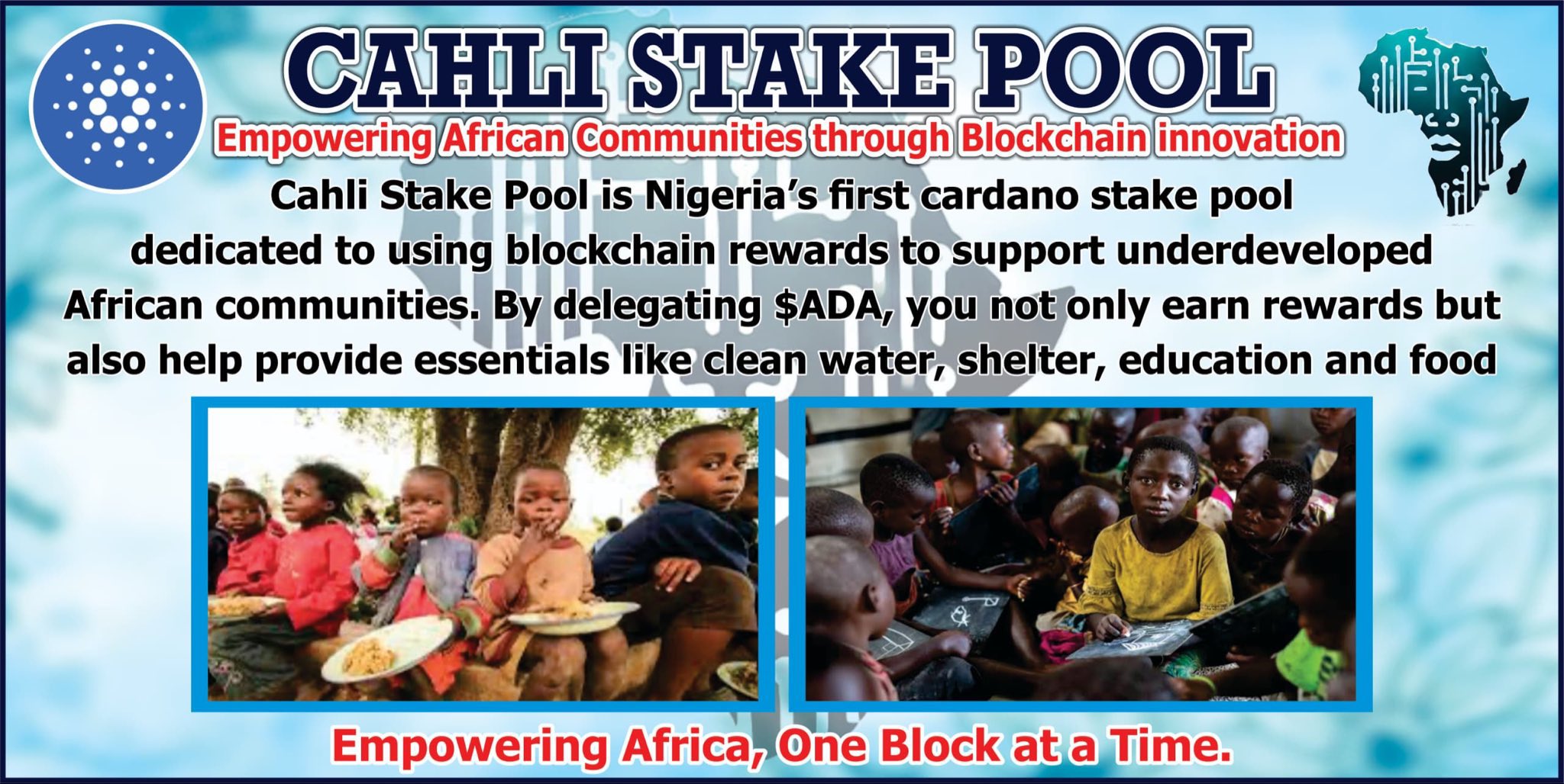 Cahli Stake Pool is more than just a staking pool. We are Africa's first step into decentralized finance through Cardano, offering delegators reliable rewards while making a real difference in society. Every ADA you stake not only grows your wealth but also fuels blockchain adoption and supports community-driven projects in Nigeria and across Africa.